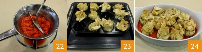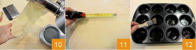 Reprenez ensuite les pâtes fraîches, divisez-les pour en passer 100-150 g à la fois dans la machine à étaler les pâtes (vous pouvez également étaler avec un rouleau à pâtisserie long), en réglant du niveau le plus bas à celui le plus élevé afin d'obtenir une feuille très fine 10. Ensuite, découpez des carrés de 13 cm 11 de côté dans les rectangles obtenus avec une roulette à pâte : vous devrez en obtenir 20. Beurrez soigneusement un moule à muffins qui servira à cuire les pochettes 12.