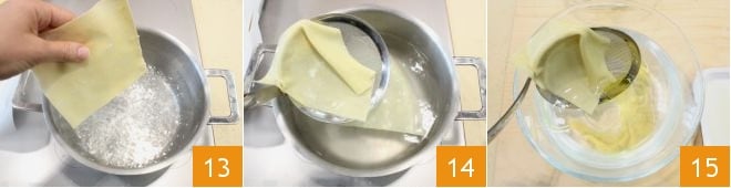 puis plongez un ou deux carrés de pâte dans de l'eau bouillante (l'eau doit être frémissante) pendant quelques instants 13 et égouttez-les 14, passez-les dans un bol d'eau froide 15, puis étalez-les sur un plateau légèrement huilé (ainsi les rectangles de pâte ne colleront pas au fond en séchant) 15.