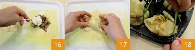 Garnissez 10 carrés de pâtes fraîches avec un peu d'artichauts et quelques morceaux de burrata 16, posez un autre carré de pâte tourné de 45° dessus 17, puis placez chaque pochette farcie dans le moule à muffins et fermez-la avec deux brins de ciboulette 18. Enfournez-les pendant 2 minutes en mode grill.