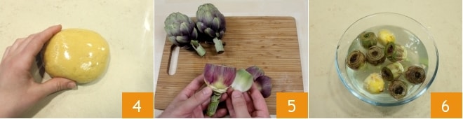 Formez une boule et enveloppez-la dans un film plastique 4 puis laissez reposer la pâte à température ambiante pendant environ 30 minutes. Pendant ce temps, vous pouvez vous consacrer au nettoyage des artichauts : portez des gants jetables pour usage alimentaire ou frottez vos mains avec du citron pour qu'elles ne noircissent pas pendant le nettoyage. Préparez les artichauts en coupant la partie supérieure la plus pointue et en les épluchant jusqu'à atteindre les feuilles les plus tendres 5. Ensuite, nettoyez également la tige en éliminant la partie la plus externe et plongez les artichauts nettoyés dans un bol avec de l'eau et du citron pour qu'ils ne noircissent pas 6.