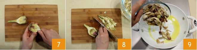 À ce stade, coupez les artichauts en deux et avec un petit couteau, retirez la barbe intérieure 7, puis réduisez-les en julienne 8. Arrosez une poêle d'un filet d'huile et faites revenir une gousse d'ail (vous pouvez la faire frire entière si vous voulez ensuite l'enlever ou hachée, comme vous préférez); ajoutez ensuite les artichauts 9, assaisonnez à volonté avec du sel et du poivre pour les aromatiser. Ajoutez un peu d'eau pour les étuver (ou déglacez-les avec du vin blanc) et laissez-les cuire 5 à 10 minutes pour qu'ils s'assouplissent. En fin de cuisson, ajoutez quelques feuilles de thym. Prenez la burrata du réfrigérateur, coupez-la en morceaux et mettez-la à égoutter dans une passoire pour qu'elle perde l'excès de petit-lait.