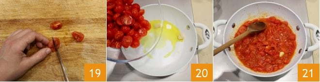 Pour la sauce tomate, lavez soigneusement et coupez les tomates cerises en moitié ou en quartiers 19; puis mettez-les dans une casserole où vous aurez fait légèrement revenir une gousse d'ail coupée en deux (ainsi il sera plus facile de l'enlever par la suite); assaisonnez avec du sel et du poivre, faites cuire les tomates cerises quelques minutes pour qu'elles ramollissent 21 puis aromatisez avec les feuilles de basilic.
