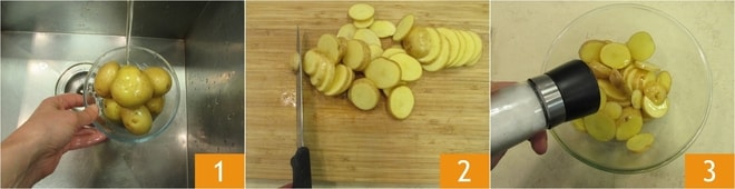 Pour préparer les filets de dorade et pommes de terre à la poêle, commencez par bien laver les pommes de terre 1 et sans les éplucher, coupez-les en tranches d'environ 4 mm d'épaisseur 2. Transférez-les dans un bol et assaisonnez avec du sel 3, du poivre noir et de l'huile.