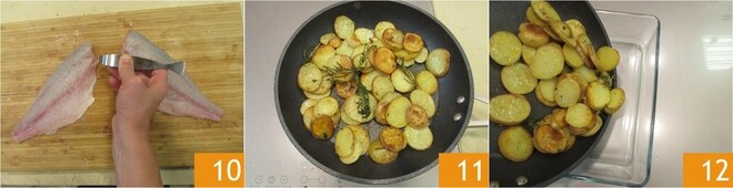 Avec une pince adaptée, retirez également les éventuelles arêtes 10. Lorsque les pommes de terre seront tendres et bien dorées 11, transférez-les dans un contenant et réservez-les 12.
