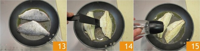 Dans la même poêle où vous venez de cuire les pommes de terre, versez un filet d'huile et placez-y les filets de dorade 13. Faites cuire pendant environ 10 minutes, toujours à feu doux, en retournant délicatement les filets à mi-cuisson 14. Assaisonnez de sel et de poivre 15.