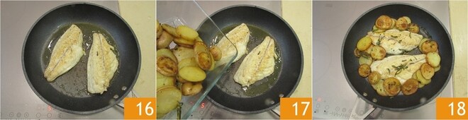 Quand les filets sont cuits 16, ajoutez les pommes de terre 17. Laissez-les réchauffer 18 et servez vos filets de dorade et pommes de terre à la poêle !