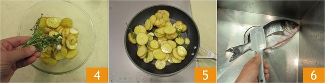 Ajoutez également la gousse d'ail épluchée, les brins de thym et de romarin 4. Versez les pommes de terre dans une grande poêle et faites-les cuire à feu moyen-doux pendant environ 30 minutes. Essayez de ne pas les retourner pour ne pas les casser, mais seulement de les faire sauter. Pendant ce temps, occupez-vous de la préparation de la dorade. Éviscérez le poisson et écailler-le avec l'outil approprié 6, ou avec un couteau, en utilisant la lame du côté non tranchant.