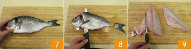 Placez la dorade sur une planche à découper 7 et à l'aide d'un couteau à fileter, prélevez le premier filet 8. Retournez le poisson et prélevez l'autre filet. Ensuite, parez les deux filets en éliminant la partie sous le ventre 9.