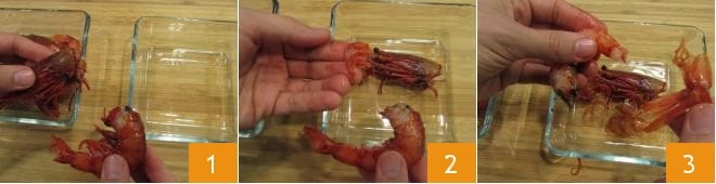 Pour réaliser les fingers de bufflonne, commencez par nettoyer les crevettes rouges : détachez la tête 1, les pattes 2 et la carapace, y compris la queue 3.