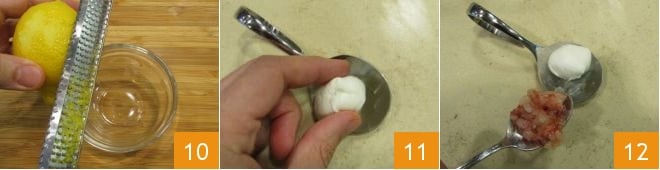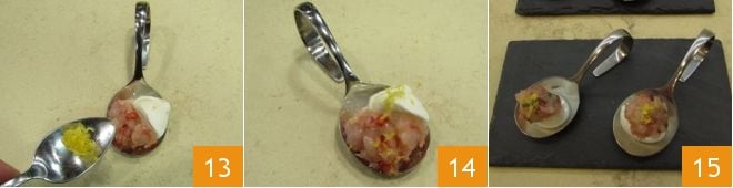 Râpez le zeste de citron et recueillez-le dans un petit bol 10. Tout est prêt pour composer les fingers de bufflonne et crevettes : prenez une cuillère à apéritif et posez-y un morceau de bufflonne 11, ajoutez également les crevettes 12.