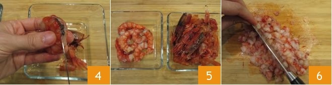 Incisez le dos avec un couteau et extrayez l'intestin, c'est-à-dire le filet noir 4. Une fois les crevettes nettoyées 5, hachez-les au couteau sans les hacher excessivement 6.