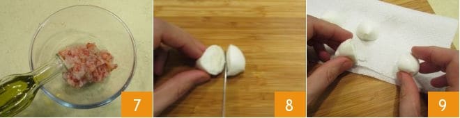 Mettez-les dans un bol et assaisonnez-les avec de l'huile d'olive 7, du sel et du poivre. Lavez et séchez le basilic, coupez-le en fines lanières et versez-le dans le bol, mélangez pour assaisonner. Maintenant, égouttez les morceaux de bufflonne de leur eau de conservation, coupez-les en deux 8 et tamponnez-les délicatement avec un torchon 9.