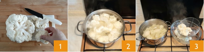 Pour préparer le flan de chou-fleur, retirez les feuilles extérieures et le trognon central, puis détachez délicatement les bouquets à l'aide d'un petit couteau. Faites cuire les bouquets dans de l'eau bouillante 2. Après 20 minutes, ils seront ramollis, vous le sentirez avec les dents d'une fourchette. Égouttez-les et écrasez-les encore chauds 3.
