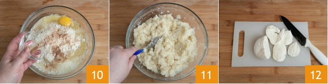 la noix de muscade 10 et mélangez bien le tout avec une cuillère 11. Coupez la mozzarella en tranches fines et réservez 12.