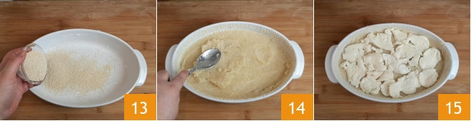 Beurrez un plat allant au four et saupoudrez l'intérieur de chapelure 13. Versez la moitié de la purée de chou-fleur et de pommes de terre au fond du plat et nivelez avec le dos de la cuillère 14, puis recouvrez la surface avec une partie de la mozzarella 15.