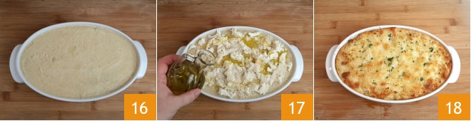 Recommencez maintenant en versant le reste de la purée 16, toujours en nivelant, et terminez avec le reste de la mozzarella. Saupoudrez de chapelure, versez un filet d'huile et vous pouvez passer à la cuisson 17. Enfournez le flan de chou-fleur à 200° pendant environ 25 minutes dans un four statique préalablement préchauffé. Un court gratinage en fin de cuisson pour dorer la surface et vous pourrez enfin le déguster : servez-le avec une touche de persil 18.