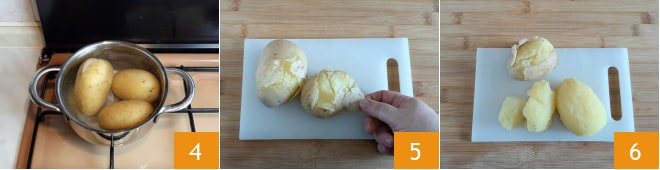 En même temps, faites cuire également les pommes de terre, en les disposant dans une grande casserole remplie d'eau 4. Portez à ébullition et faites cuire de 30 à 50 minutes selon leur taille. Une fois prêtes (faites toujours le test avec la fourchette), épluchez-les lorsqu'elles sont encore très chaudes 5 : de cette façon, la peau se détachera facilement 6.