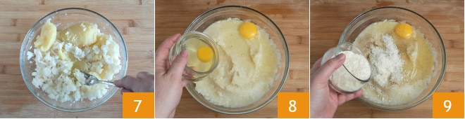 Écrasez-les également dans le bol avec les choux-fleurs pour obtenir une purée très lisse 7. Vous pouvez maintenant ajouter les œufs 9, assaisonnez de sel et de poivre, versez le fromage râpé 9,