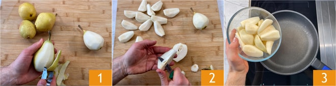 Pour préparer le gâteau de poires et chocolat, commencez par éplucher les poires coscia 1, puis divisez-les en 4 parties et retirez la partie centrale du trognon 2. Déposez les quartiers dans une poêle antiadhésive et allumez le feu à flamme haute 3.