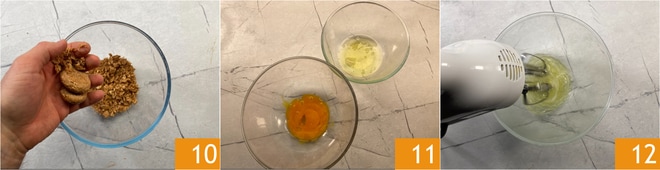Émiettez grossièrement les amaretti dans un bol 10 et réservez. Séparez les blancs des jaunes dans 2 bols 11 : avec un fouet électrique, battez les blancs pendant quelques minutes 12.