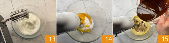 Ils ne doivent pas être montés en neige ferme mais devenir une mousse douce 13. Réservez et ajoutez le sucre aux jaunes : avec le même fouet, battez le mélange quelques minutes jusqu'à ce qu'il soit clair 14. Maintenant, réduisez la vitesse des fouets et versez le chocolat fondu en filet, en les gardant toujours en action 15.
