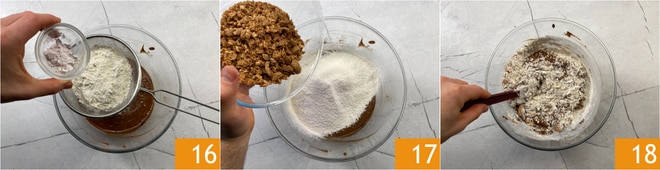 Éteignez les fouets et tamisez la farine et la levure dans le bol 16. Ajoutez également les amaretti 17 et mélangez bien le tout 18.