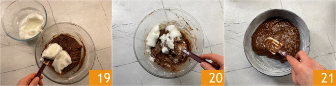 À ce stade, incorporez les deux tiers des blancs d'œufs en remuant énergiquement pour assouplir le mélange 19, puis ajoutez le tiers restant et incorporez-le en remuant plus délicatement avec des mouvements de bas en haut 20. Transférez la moitié de la pâte dans un moule de 24 cm beurré et fariné, puis nivelez la surface 21.