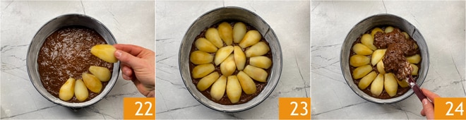 Disposez les quartiers de poire avec la partie bombée vers le haut 22 en les disposant en rayon 23, puis versez la partie restante de la pâte 24.