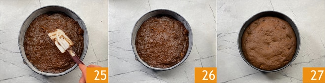 Nivellez à nouveau la surface avec la spatule 25 et faites cuire dans un four statique préchauffé à 180° pendant environ 45 minutes. Faites le test du cure-dent avant de sortir le gâteau du four : s'il est légèrement crémeux à l'intérieur, vous pouvez le retirer du four et le laisser refroidir complètement à température ambiante, de cette manière, la pâte évitera de se dessécher excessivement 26. Le gâteau de poires et chocolat est prêt à être dégusté 27 !
