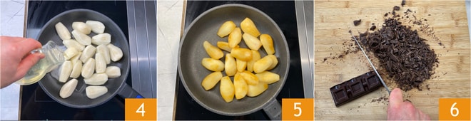 Arrosez avec le muscat 4 et laissez cuire une dizaine de minutes, en les retournant de temps en temps : le vin doit se réduire et les poires doivent se colorer ; une fois prêtes, laissez-les tiédir. Pendant ce temps, hachez le chocolat fondant 6.