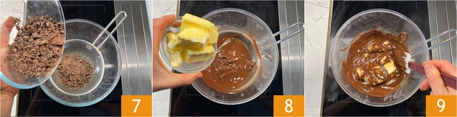Faites fondre le chocolat au bain-marie en remuant avec une spatule 7. Une fois fondu, éteignez le feu et ajoutez le beurre à température ambiante 8, en remuant continuellement pour le faire fondre. Réservez 9.