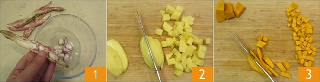 Pour réaliser le gâteau de pain et légumes, commencez par préparer les ingrédients : écossez les haricots frais 1, puis pelez les pommes de terre et coupez-les en dés 2. Nettoyez la courge et coupez-la également en dés 3. Il vous faudra environ 150 g de haricots écossés et 160 g de pulpe de courge.