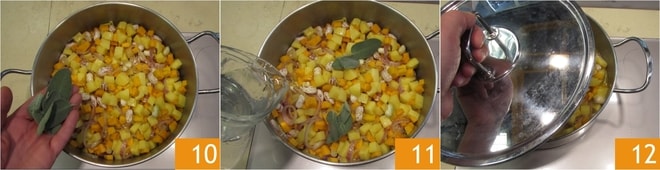 Parfumez avec les feuilles de sauge 10, salez, poivrez et versez l'eau chaude 11. Faites cuire avec le couvercle environ 20 minutes à feu moyen-doux, en remuant de temps en temps 12.