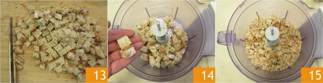 Entre-temps, coupez le pain rassis en dés 13, transférez-le dans un mixeur 14 et broyez pour le réduire en miettes 15.
