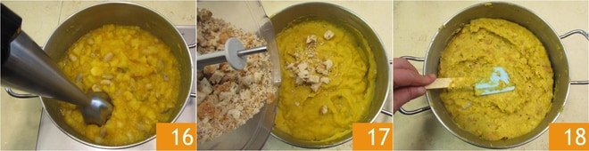Lorsque les légumes sont cuits, éteignez le feu et mixez avec un mixeur plongeant 16. Ajoutez le pain mixé au mélange chaud de légumes 17 et mélangez le tout 18.