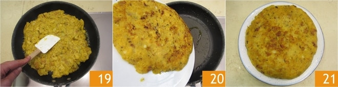 À ce stade, chauffez bien une poêle avec un filet d'huile, puis versez le mélange à l'intérieur et aplatissez-le pour égaliser la surface 19. Faites cuire pendant quelques minutes à feu doux, juste le temps de former une croûte, puis retournez délicatement l'"omelette" à l'aide d'une assiette et faites-la glisser à nouveau dans la poêle 20 ; faites attention car la consistance est assez molle. Faites cuire également de l'autre côté pendant quelques minutes, après quoi votre gâteau de pain et légumes est prêt à être servi chaud 21 !
