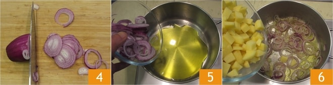 Enfin, épluchez l'oignon et émincez-le finement 4. Versez l'oignon dans une poêle avec un filet d'huile chaude 5, puis ajoutez les pommes de terre 6.