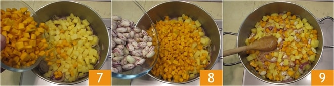 Ajoutez également la courge 7 et les haricots 8 et mélangez pendant 3-4 minutes à feu moyen 9.