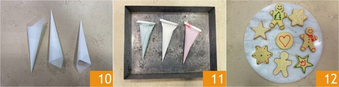 Maintenant, préparez les cornets en papier sulfurisé 10 et remplissez-les 11. Amusez-vous à décorer les biscuits 12.