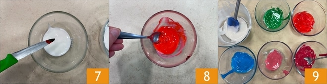 Ajoutez un peu de colorant alimentaire 7 et mélangez 8. Ajoutez progressivement le colorant jusqu'à obtenir la teinte désirée. Préparez de cette manière les autres couleurs, avec ces quantités, vous pourrez en réaliser jusqu'à 6 9.