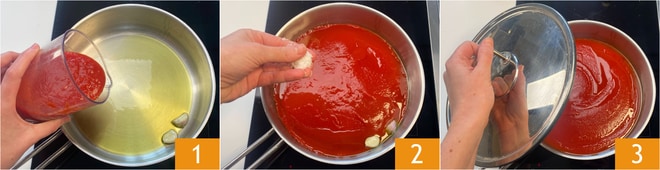 Pour réaliser les gnocchis de pain rassis, commencez par préparer la sauce : dans une casserole, faites revenir avec un filet d'huile 2 gousses d'ail, puis ajoutez la purée de tomates 1 et un peu d'eau, juste ce qu'il faut pour rincer le pichet. Salez 2, mélangez et couvrez avec le couvercle 3. Faites cuire à feu doux pendant environ 40 minutes, en remuant de temps en temps.