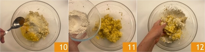 Assaisonnez avec du sel, du poivre et de la noix de muscade 10, puis mélangez la préparation avec les mains. Enfin, ajoutez la farine 11 et travaillez encore rapidement, juste le temps d'obtenir une pâte homogène 12.
