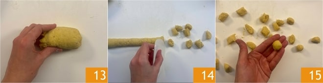 Saupoudrez le plan de travail d'un peu de farine et prélevez une portion de pâte à la fois 13, en la modelant pour former des boudins. Coupez les boudins en morceaux à l'aide d'une corne 14, puis arrondissez-les pour obtenir des boules 15. Disposez les gnocchis au fur et à mesure sur un plateau légèrement fariné.