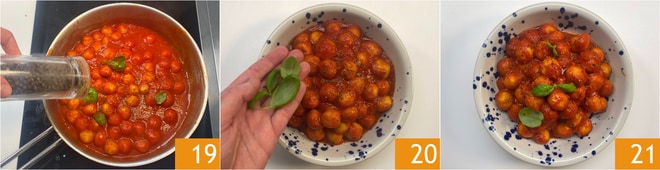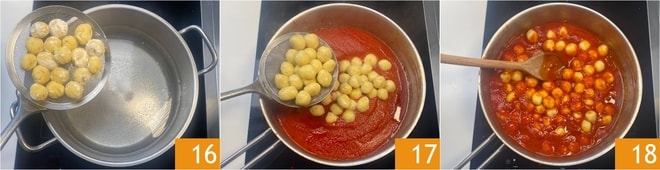 Lorsque la sauce sera prête, portez à ébullition une casserole d'eau salée et faites cuire les gnocchis en 2 fois 16. Égouttez les gnocchis dès qu'ils remontent à la surface et transférez-les dans la poêle avec la sauce 17, puis mélangez délicatement 18.