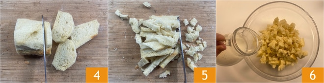 Entre-temps, occupez-vous des gnocchis : prenez le pain rassis dont vous aurez enlevé la croûte et coupez-le d'abord en tranches 4 puis en cubes 5. Transférez les cubes de pain dans un bol et arrosez-les de lait 6.