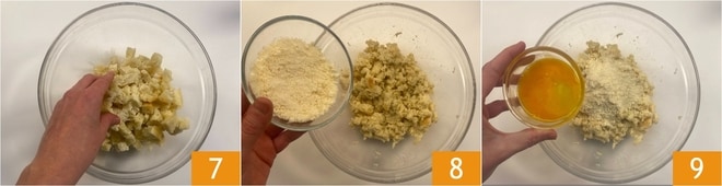 Émiettez le pain imbibé avec le bout des doigts 7 ; si le pain est très sec, vous pourriez avoir besoin de le laisser reposer une quinzaine de minutes, en le travaillant de temps en temps afin de le réduire complètement en miettes. Ajoutez le Grana Padano DOP râpé 8 et les œufs 9.