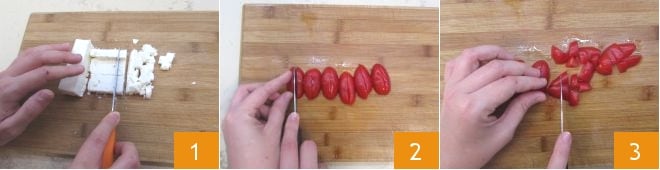 Pour préparer la salade de pâtes aux pêches, commencez par découper tous les ingrédients. D'abord, coupez la feta en dés d'environ un demi cm 1, puis coupez les tomates cerises en quartiers dans le sens de la longueur 2 et ensuite en petits morceaux 3.