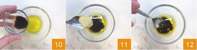 Préparez ensuite la vinaigrette : dans un petit bol, mélangez l'huile et le vinaigre balsamique 10, ajoutez une pointe de moutarde 11 et émulsionnez bien en fouettant avec une cuillère à café 12 (si vous préférez, vous pouvez émulsionner également avec un mixeur plongeant ou secouer les ingrédients après les avoir placés dans un bocal hermétique).