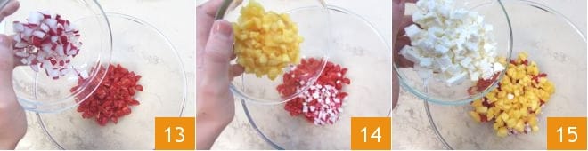 Dans un grand bol, réunissez maintenant les tomates cerises, les radis 13, les pêches 14, la feta 15.