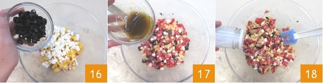 Et les olives en rondelles 16, mélangez bien et assaisonnez le tout avec la vinaigrette 17. Réglez enfin le sel 18, et mettez de côté.